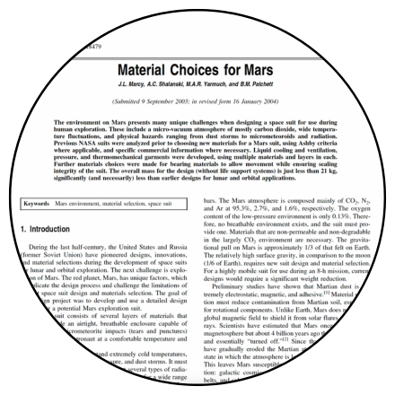 The environment on Mars presents many unique challenges when designing a space suit for use during human exploration. These include a micro-vacuum atmosphere of mostly carbon dioxide, wide temperature fluctuations, and physical hazards ranging from dust storms to micrometeoroids and radiation.